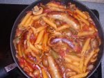 - Pour in the tomatoes, Worcestershire sauce and stock then add the pasta and beans. Season then mix well, bring to the boil, then simmer for about 30 minutes until the sausages are cooked and the pasta is tender. This should give you a rich sauce. If the sauce is too thick simply add a little more water. If it is too thin boil rapidly for a couple of minutes to thicken it.