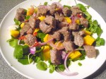 We first had this salad about eleven years ago, shortly after we returned from living in America. It has been a firm favourite ever since and we eat it at least once a month and more often if I think about making it. Although this is classed as a salad it could not be further away from what I grew up to understand salads to be, i.e. lettuce, tomatoes and cucumber! The tender chunks of beef, straight from the pan, absorb the hot and spicy salad dressing. The sweetness of the mango is in perfect contrast with the beef and the heat from the red onion and the watercress. Your senses will rarely be subjected to such an attack on all levels, smell, taste and sight! Absolutely delicious and very low in fat, carbohydrate and calories so excellent for anyone who is hoping to lose weight. What more could you ask for?