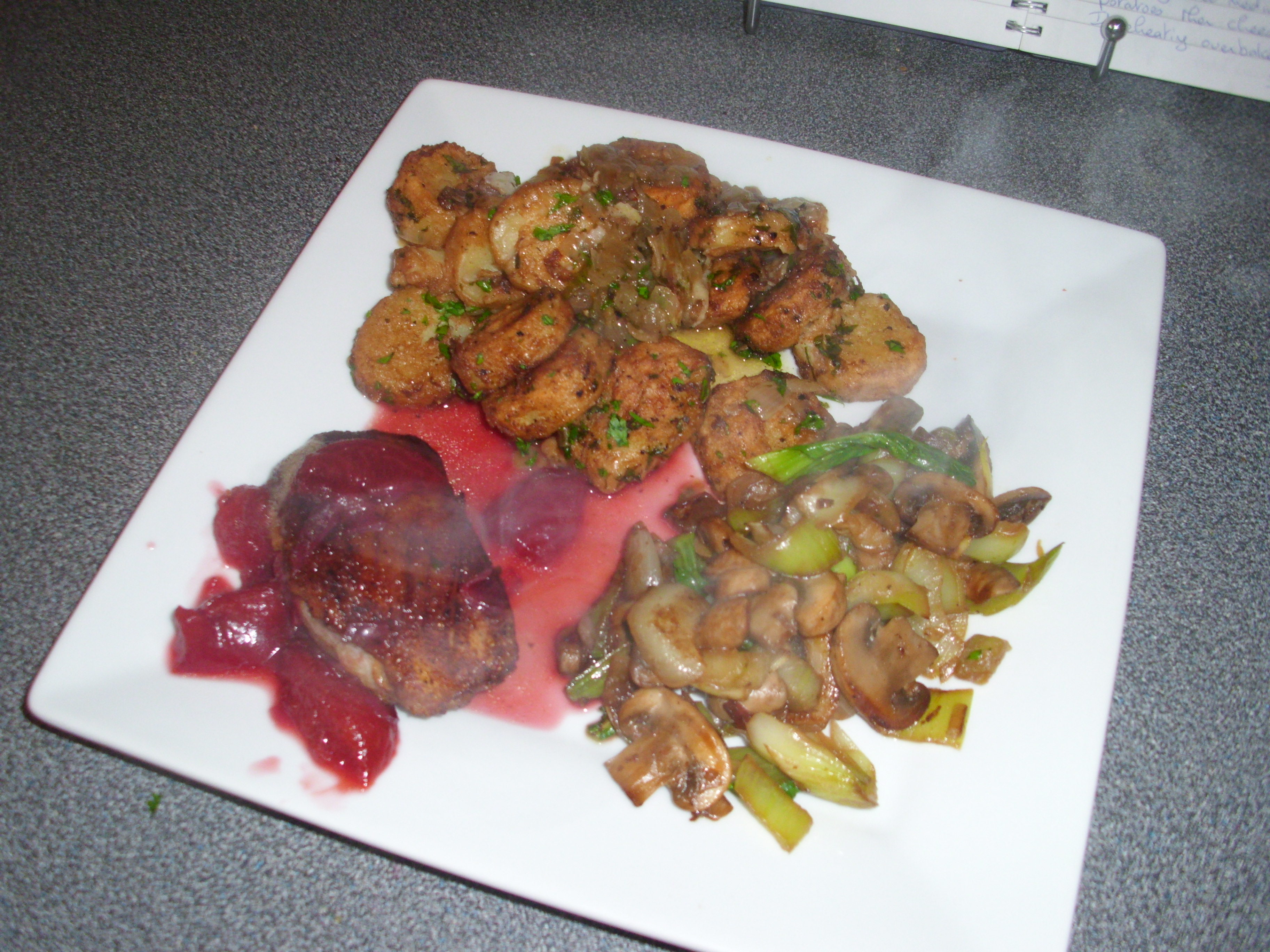 - I served mine with stir fried mushrooms, onions and pak choy and potatoes in shirts (recipe in next post) but this would be equally as good served thinly sliced, topped with sauce and accompanied by mashed potatoes and a green vegetable such as broccoli.
