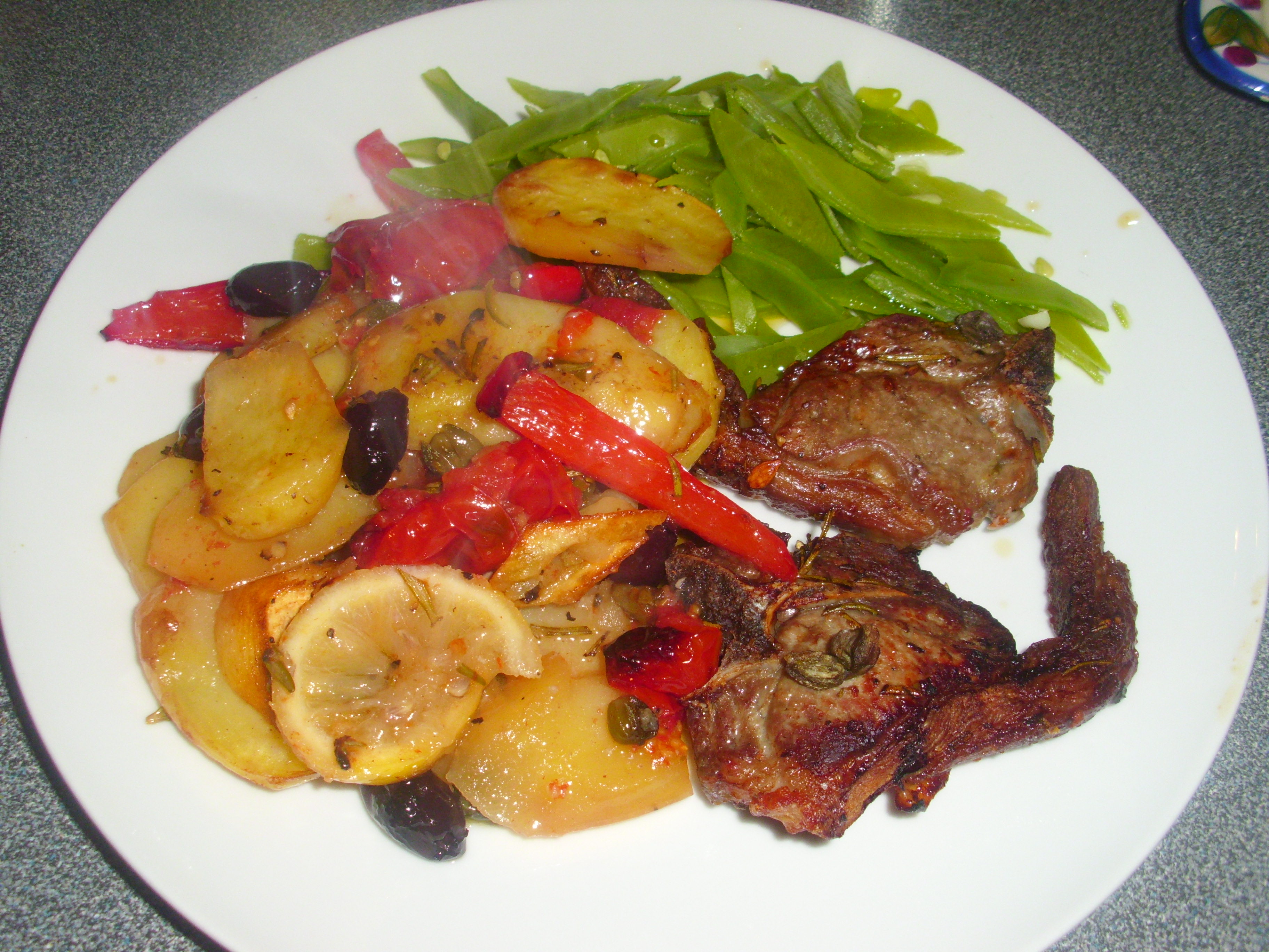 - Remove the dish from the oven, loosen any potatoes that are sticking the add the peppers, lemon slices, rosemary sprig and tomatoes. Mix well making sure the chops stay on the top. Return to the oven for another 10 minutes.